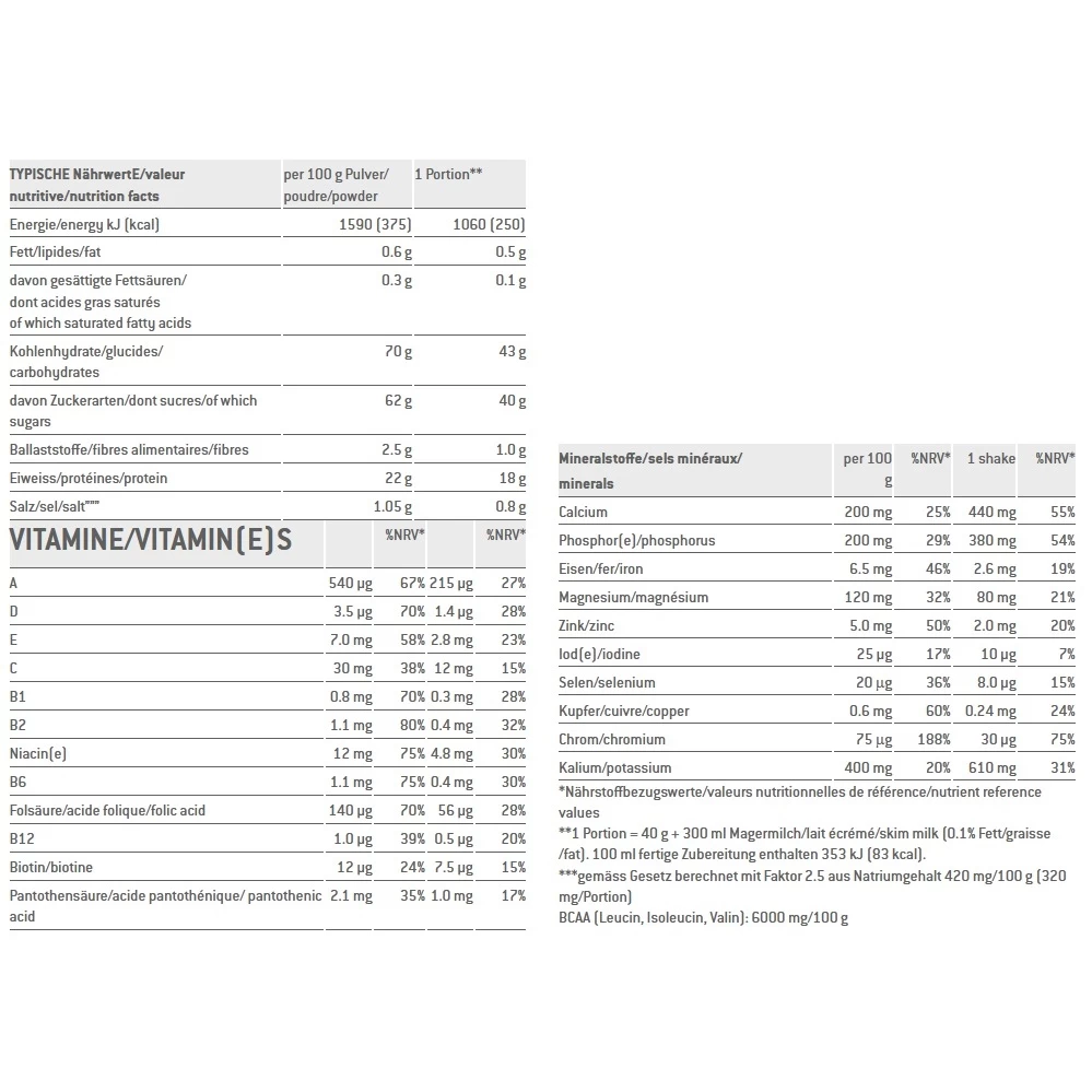 - Zutaten: Milcheiweiss 17% (Milchproteinkonzentrat, Molkeprotein-Isolat, Casein), Saccharose, Fructose, Magermilchpulver, Molkepulver, Dextrose, Maltodextrin, L-Leucin 3%, L-Glutamin 3%, Bananenpulver 2.5%, Verdickungsmittel (Guarkernmehl, Xanthan, Natriumalginat), Aromen, 9 Mineralsalze (Natriumcitrat, Magnesiumcarbonat, Eisenfumarat, Zink-, Kupfer-, Mangangluconat, Kaliumiodat, Chromhefe, Natriumselenat), Emulgator Sonnenblumenlecithin, 12 Vitamine (Ascorbinsäure, alpha-Tocopherylacetat, Nicotinsäureamid, Retinylacetat, Calciumpantothenat, Cholecalciferol, Pyridoxinhydrochlorid, Riboflavin, Cyanocobalamin, Thiaminmononitrat, Folsäure, Biotin)